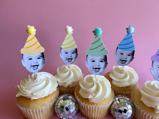 Whether you’re planning a first birthday, a christening, or a pastel-themed party, our range of personalised photo cupcake toppers will make your desserts stand out. Choose from fun designs like party hat face toppers, crown toppers, and custom colour options to match your theme.