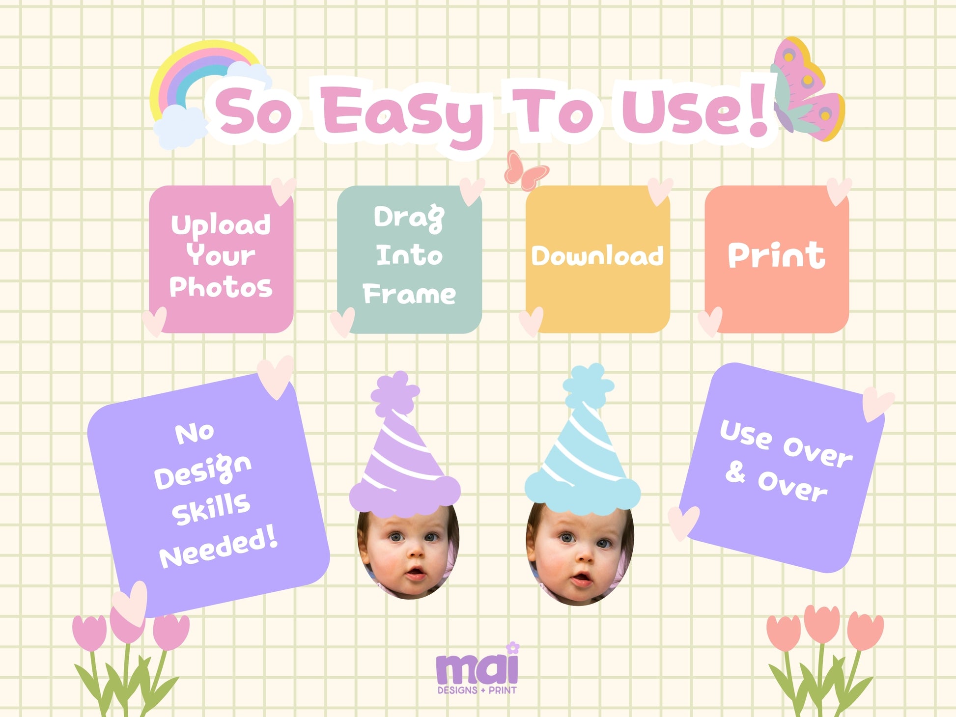 Simply upload your child’s photo, drag it into place, and instantly create fun, custom decorations — no design skills needed!